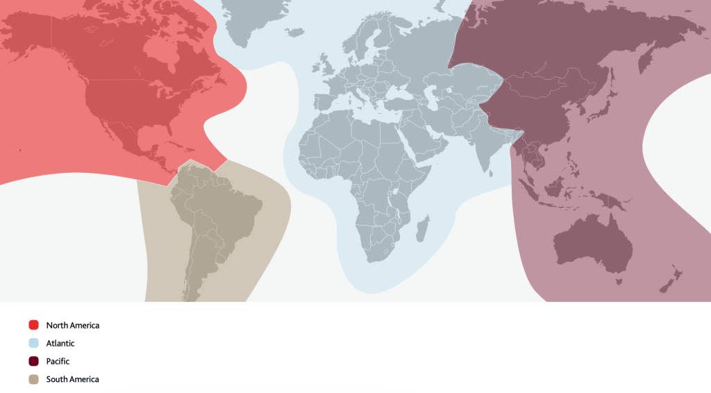 Planet Earth is divided into four zones — North America, Atlantic, Pacific, and South America. With this map, you can quickly figure out the zone of your destination; then you’ll consult one of the award charts below to see what you’ll spend. Each award chart shows you one-way award prices based on: