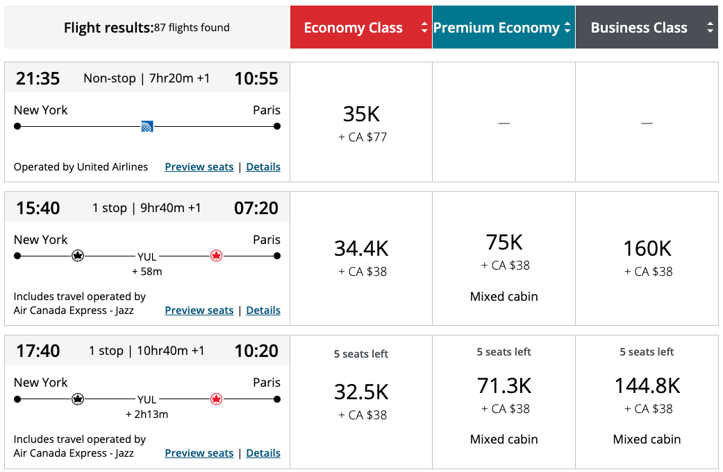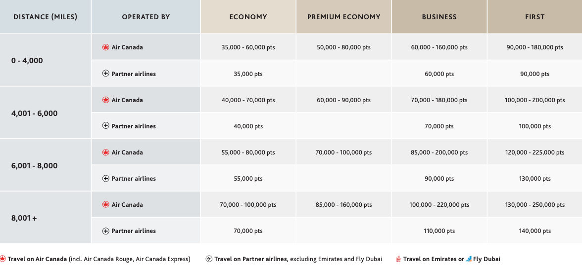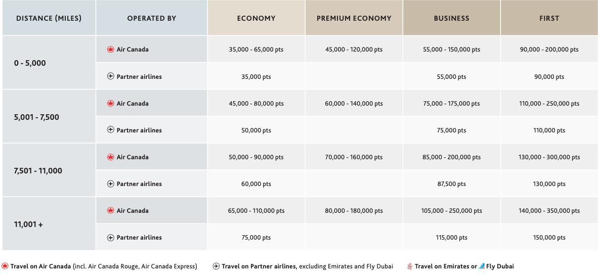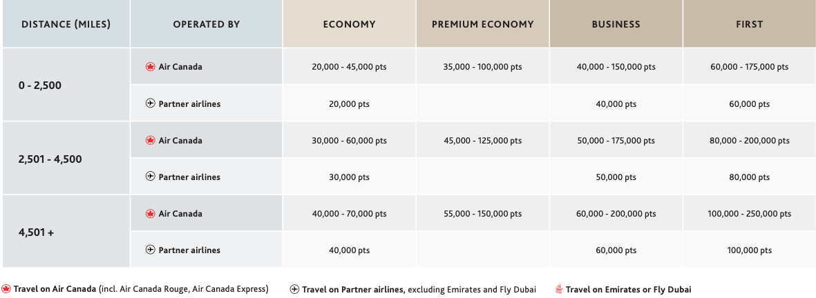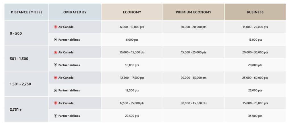 Meanwhile, Air Canada uses a more straightforward approach when pricing award seats with its airline partners. You’ll be charged according to your origin, destination, and the distance you fly. Prices don’t change day-to-day as they do with an Air Canada flight.