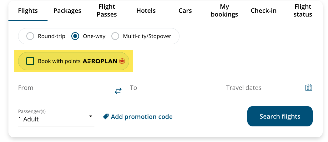 To use your Aeroplan points for flights, head over to the Aeroplan site and sign into your account. In the search box, tick the box labeled “Book with points.”