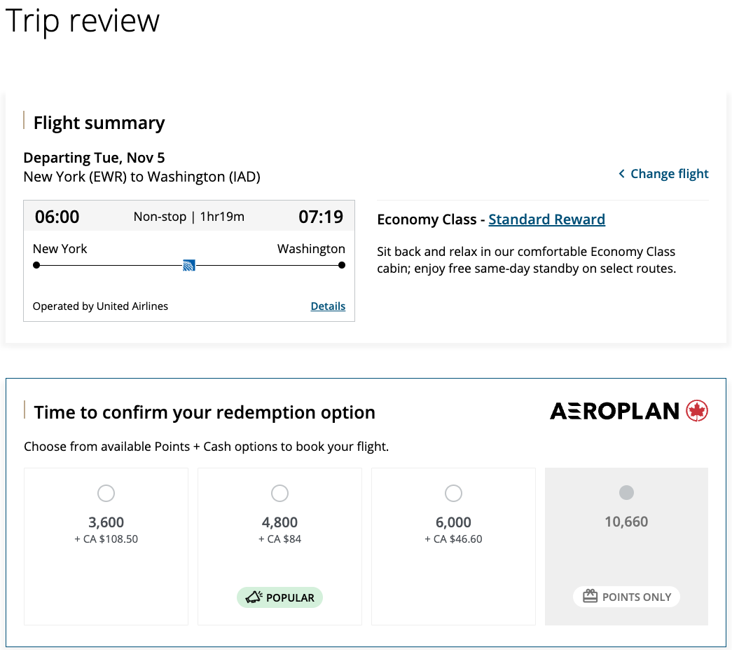 When booking a flight reward, you’ll see an option to mix your payment with cash and points. You can pay for the entire trip (including taxes and fees) with Aeroplan points, or you can choose to pay thousands of points less in exchange for cash.