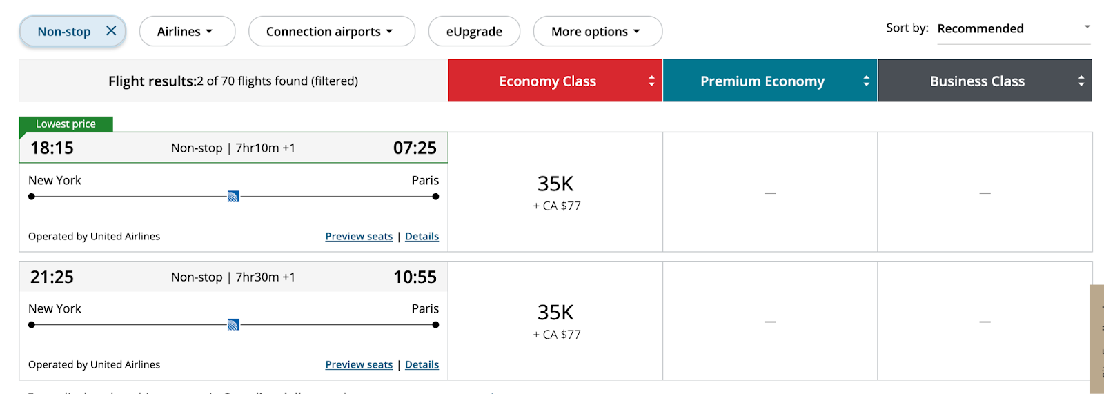 One of our favorite Aeroplan point options is redeeming them for United flights. As you can see below, a one-way, nonstop United flight in economy costs 35,000 points.