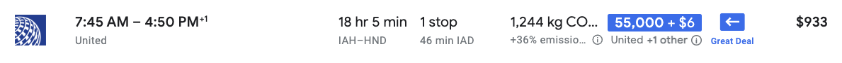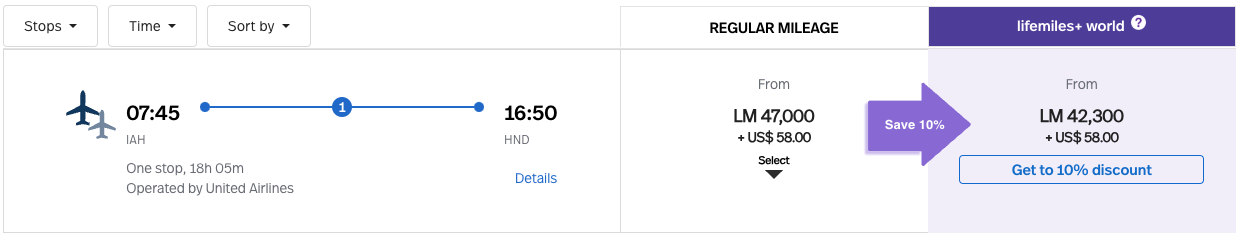 A one-way United economy ticket from Houston (IAH) to Tokyo (HND) costs up to 47,000 LifeMiles and $58 in taxes and fees.
