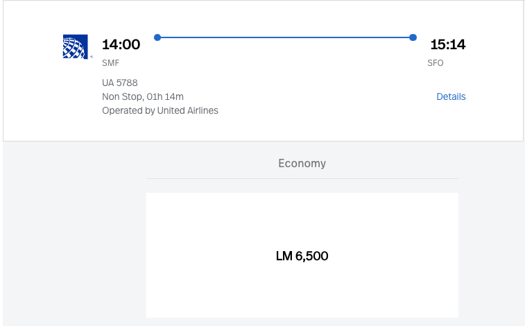 For example, an economy flight from Sacramento (SMF) to San Francisco (SFO) on United Airlines costs over $200. But you can reserve it for just 6,500 miles — giving you a value of more than three cents per mile.