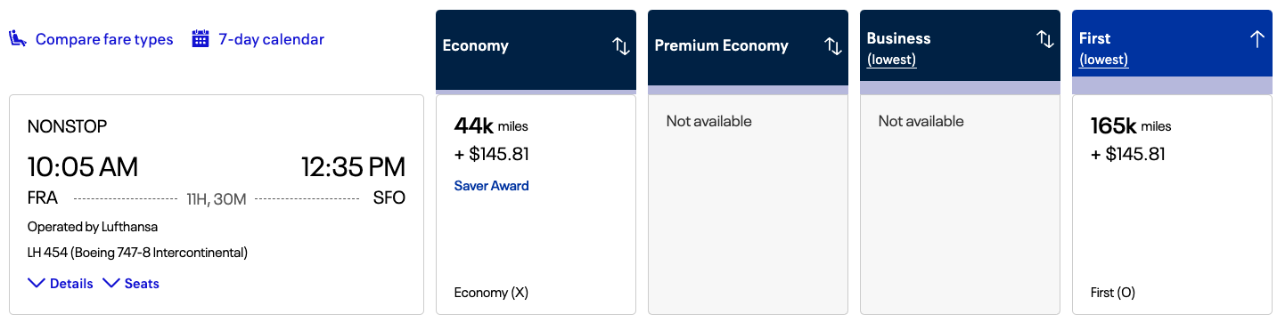 Lufthansa has an exceptional first class, especially aboard the elegant Boeing 747. You can reserve this seat between San Francisco (SFO) and Frankfurt (FRA) for 120,000 LifeMiles each way (though you’ll only find them within a few days of travel).