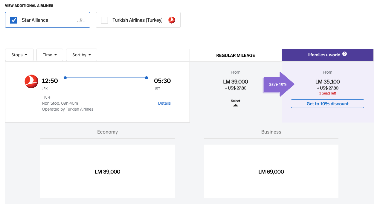 When you search for award flights, Avianca will display both Avianca and Star Alliance options. For example, Avianca doesn’t fly to Turkey — but Turkish Airlines does. Searching for a flight from New York (JFK) to Istanbul (IST) should automatically show flights with Turkish Airlines.