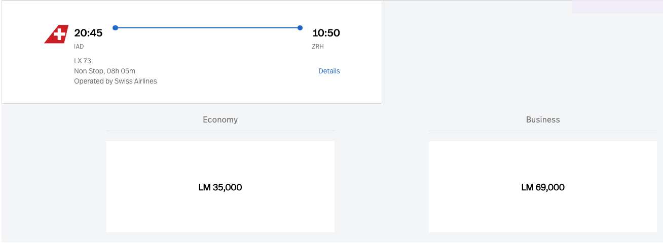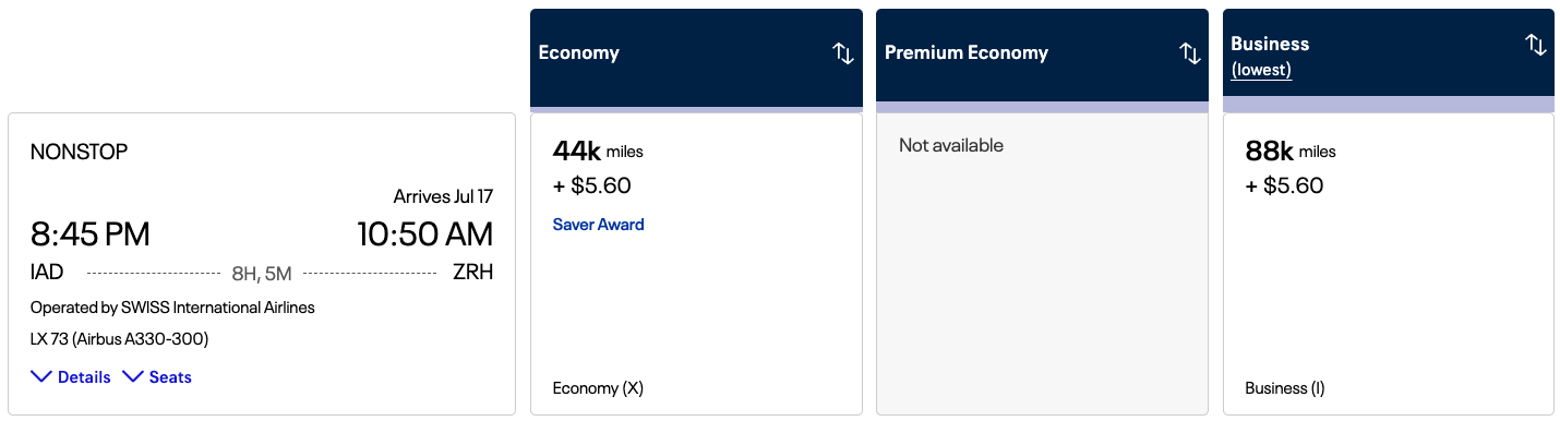 For example, a business-class ticket from Washington Dulles (IAD) to Zurich (ZRH) on partner SWISS costs 88,000 United Airlines miles one-way.