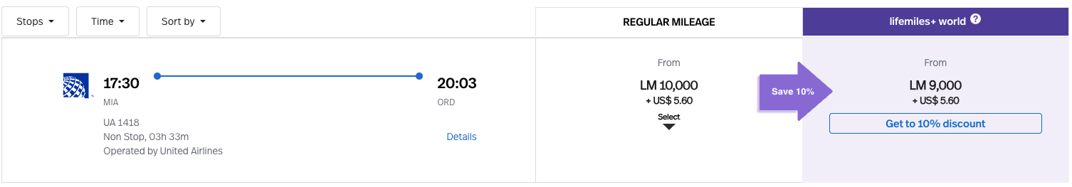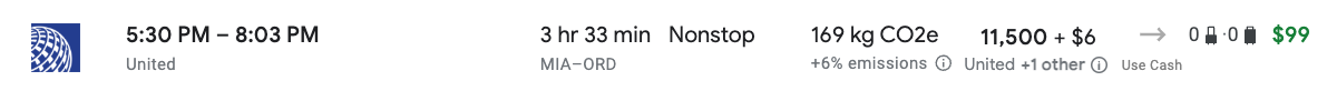 A one-way United Airlines economy-class ticket from Miami (MIA) to Chicago (ORD) costs up to 10,000 miles and $5.60 in taxes and fees.