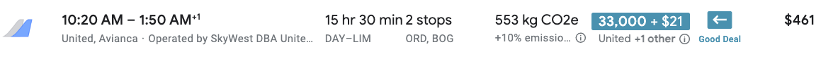 A one-way economy class ticket from Dayton (DAY) to Lima, Peru (LIM) costs up to 20,000 miles and $58 in taxes and fees. You’ll fly both United Airlines and Avianca.