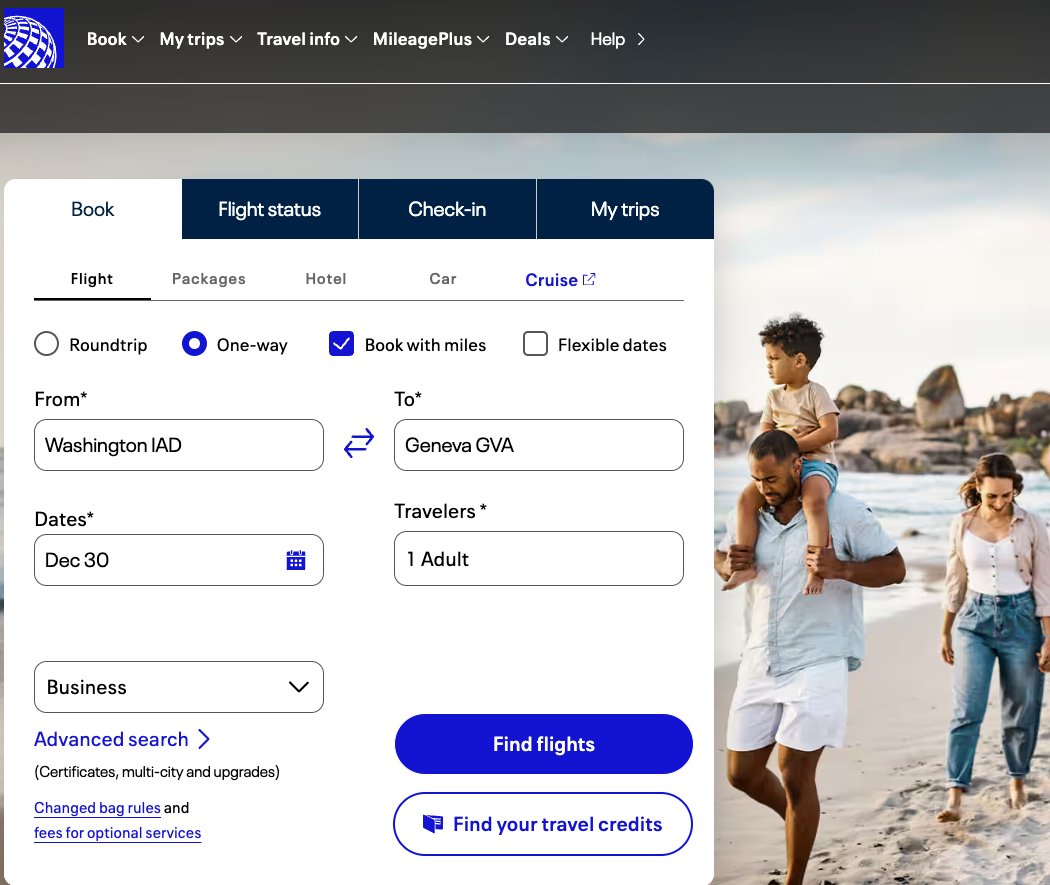 To book United Airlines Polaris with United miles, navigate to the United Airlines website and enter your desired route and dates. You can tick “flexible dates” to find available award seats.