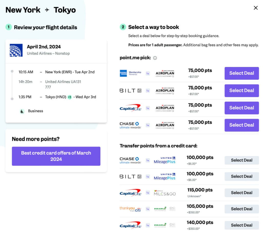 Here's an example of a one-way business class seat from Newark (EWR) to Tokyo (HND). It's flown by United Airlines and can be booked with United miles for 100,000 miles each way, but that's not the best option. Instead, point.me recommends transferring points over to Air Canada's Aeroplan to leverage the airline’s partnerships and snag that exact same flight for just 75,000 points each way. You don’t even have to fly Air Canada — you can often get the same flight for fewer points just by using the power of its loyalty program.