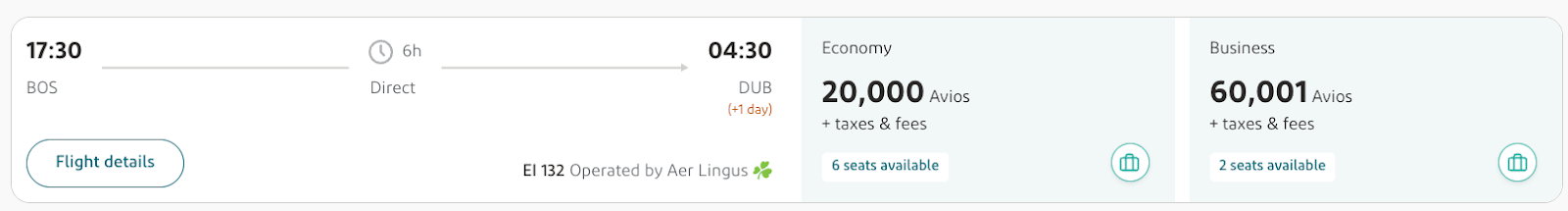 Aer Lingus will show you all results for your query — between 50,000 and 75,000 points depending on your route. As an example, here’s a flight from Boston (BOS) to Dublin (DUB) in early July 2025. You’ll pay 60,001 points and $142 in fees.