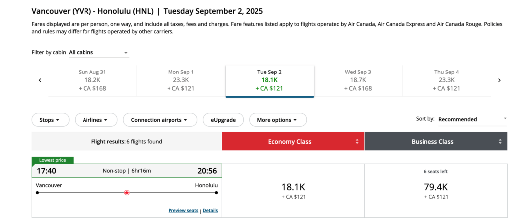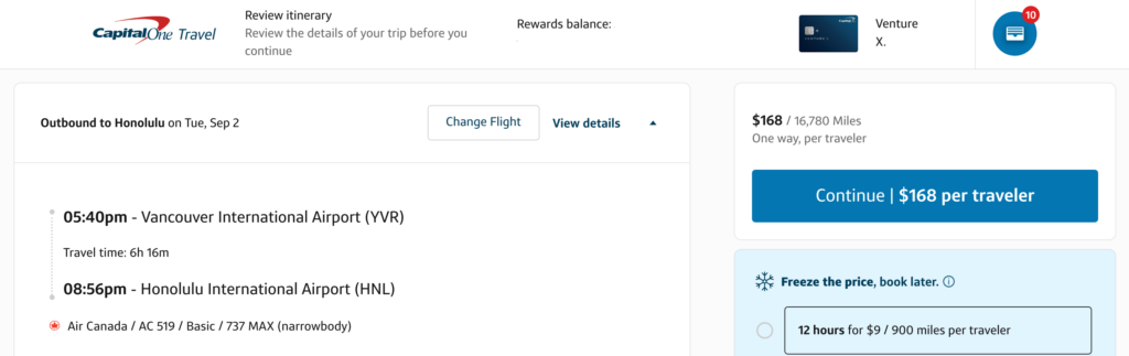 Sometimes, airlines run promotions with cheap tickets to certain destinations. For example, Capital One miles are worth 1 cent each when you book through Capital One Travel. This Air Canada economy class flight between Vancouver (YVR) and Honolulu (HNL) costs just 16,780 miles, including taxes and fees, when you redeem this way.