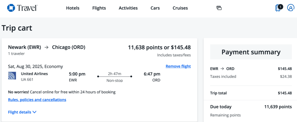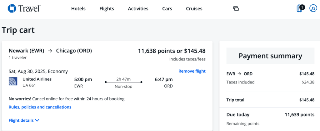 However, that’s not the best idea in this case because the flight is inexpensive. When you book flights through Chase Travel℠, your Ultimate Rewards points are worth 1.25 cents apiece when you have the Sapphire Preferred or Ink Business Preferred and 1.5 cents each with the Sapphire Reserve.