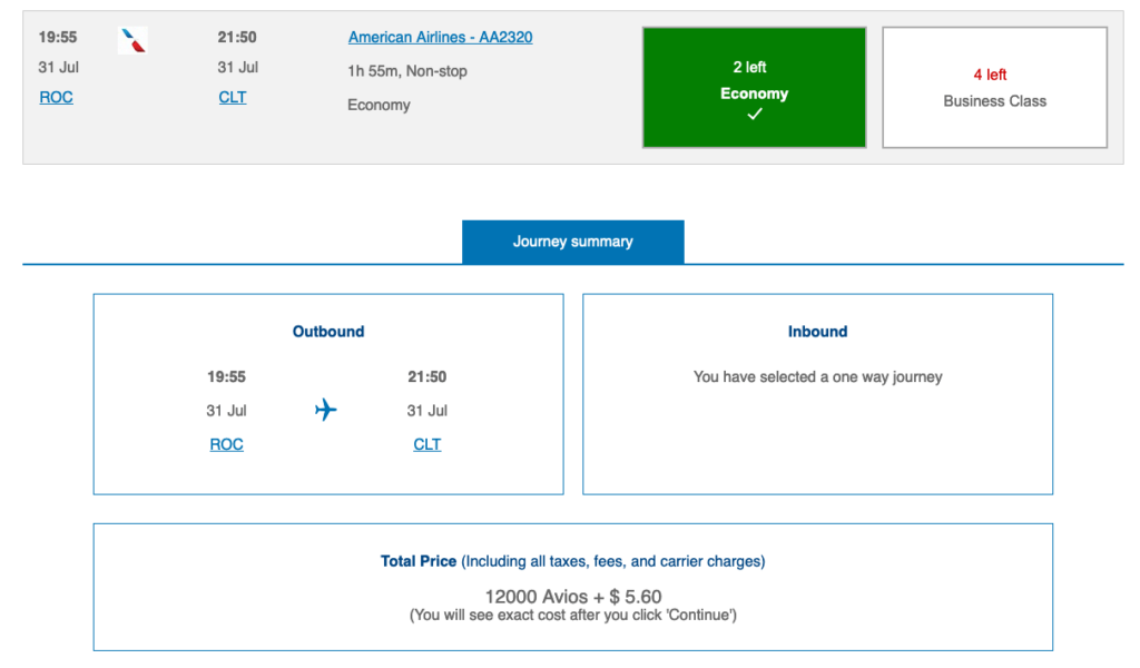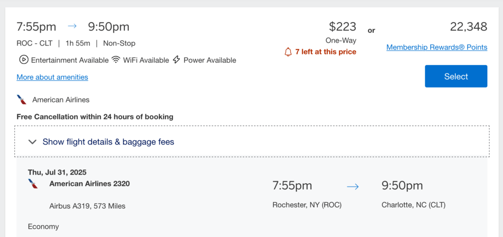 This sample American Airlines economy class flight from Rochester, New York (ROC) to Charlotte (CLT) costs $223 or 22,348 Membership Rewards points through Amex Travel.