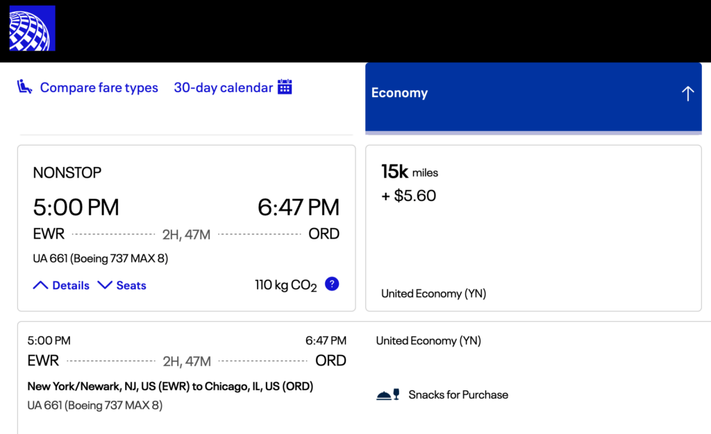 United Airlines charges 15,000 miles plus $5.60 for the economy class award flight below between Newark (EWR) and Chicago (ORD). United MileagePlus is a Chase Ultimate Rewards transfer partner, so if you have the Chase Sapphire Preferred® Card, Chase Sapphire Reserve®, or Ink Business Preferred® Credit Card, you can transfer 15,000 Chase points to United to book this flight.