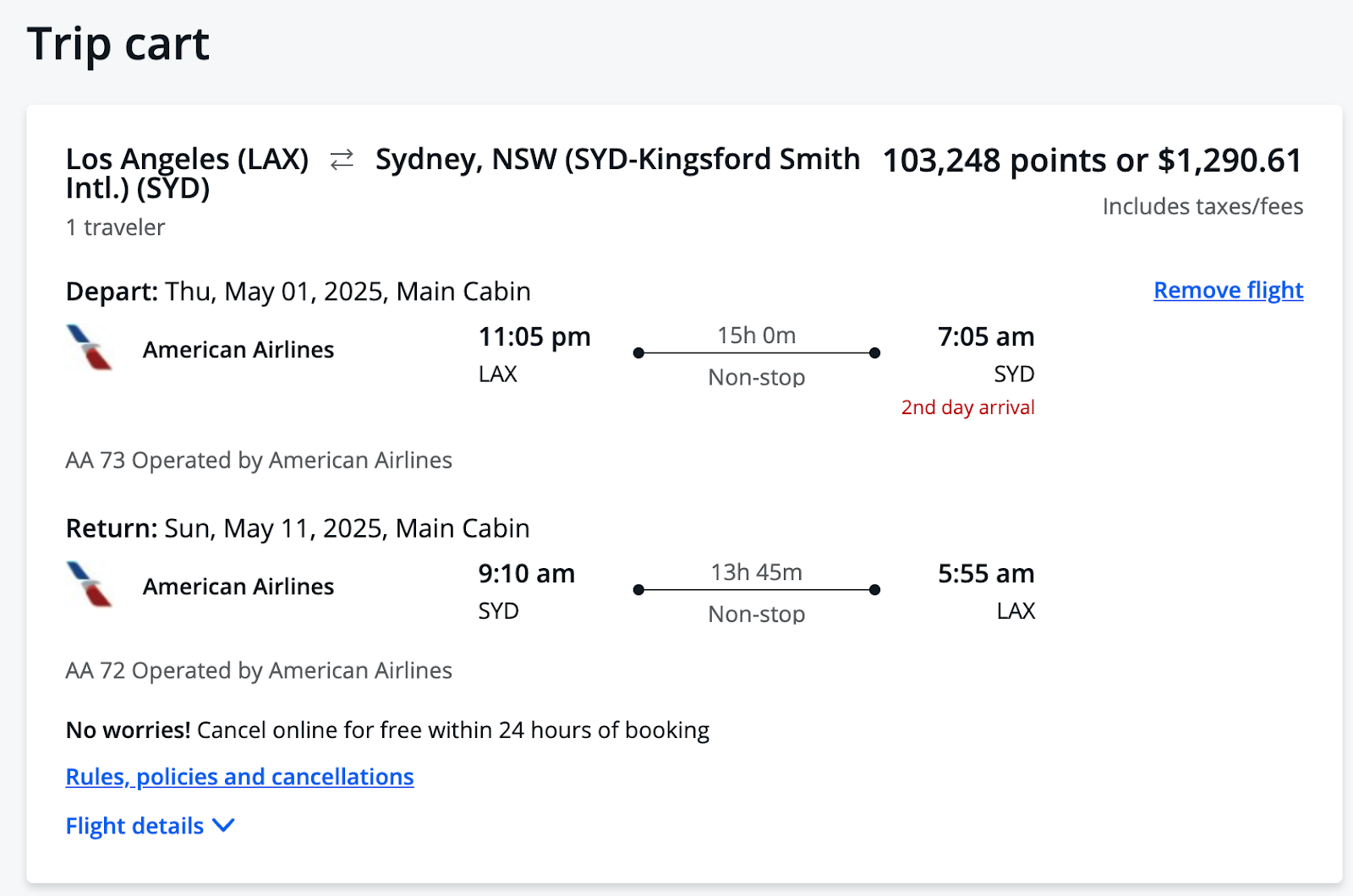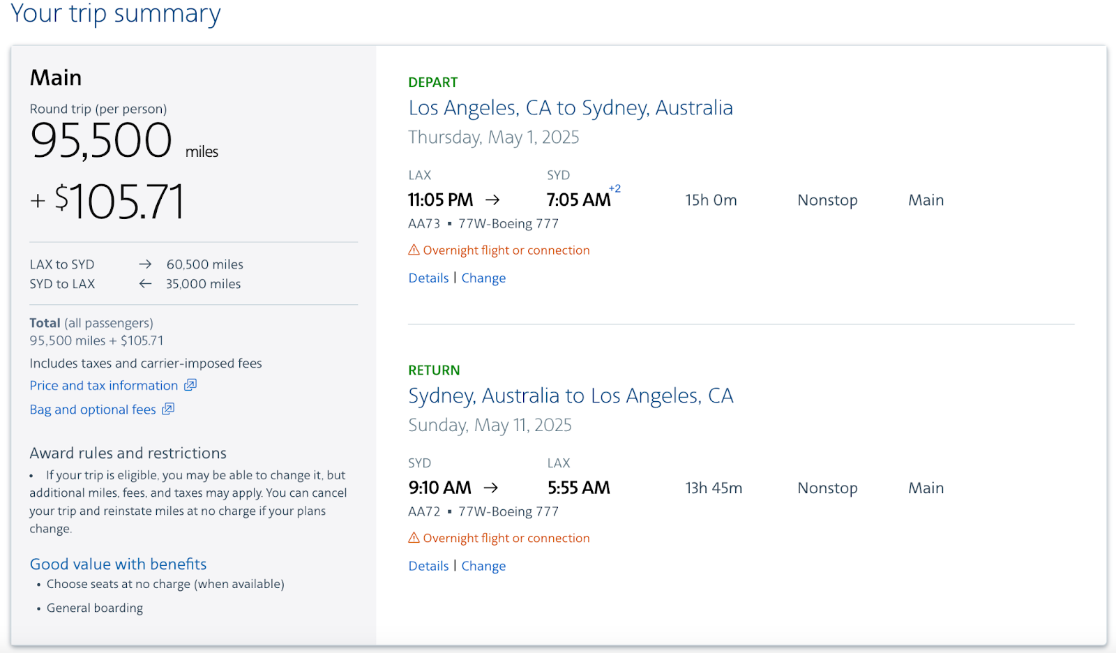 The same flight on the American Airlines website would cost 95,500 AAdvantage miles plus $105.71 in taxes and fees, so it’s a pretty comparable option.