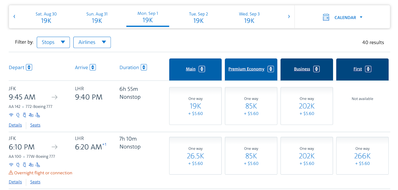 Alternatively, you can enter your flight details into the website’s Reward Flight Finder to see how many Avios you need. Just choose a flight on American Airlines metal; other options will appear for British Airways and Oneworld alliance partners.