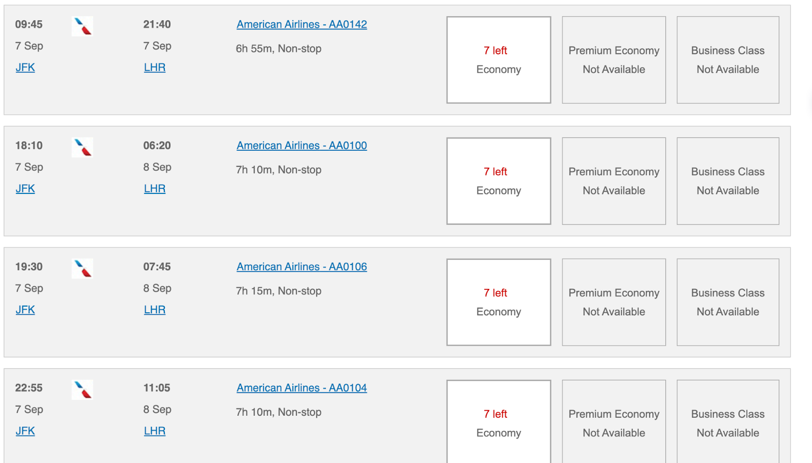 A recent search for one-way economy seats between New York (JFK) and London (LHR) in early September revealed a variety of options, including flights on British Airways, Aer Lingus, and American Airlines.