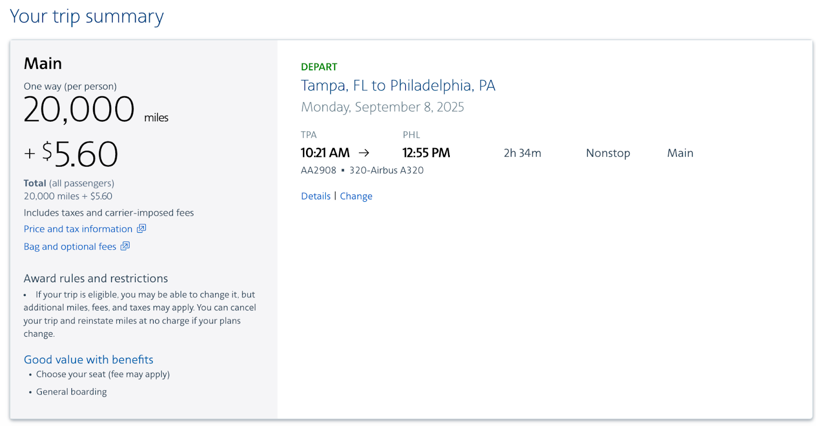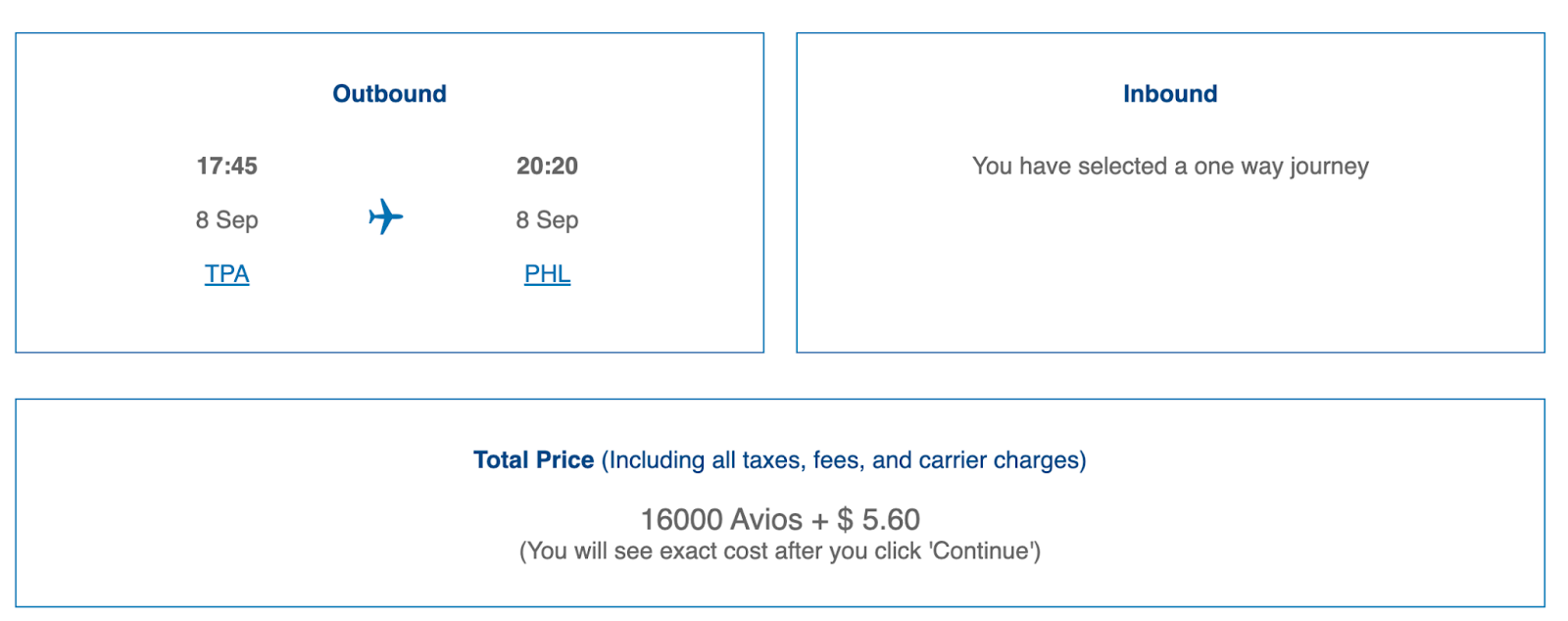 Searching for one-way flights from Tampa (TPA) to Philadelphia (PHL) in early September shows economy flights from 16,000 Avios and $5.60 in taxes and fees.