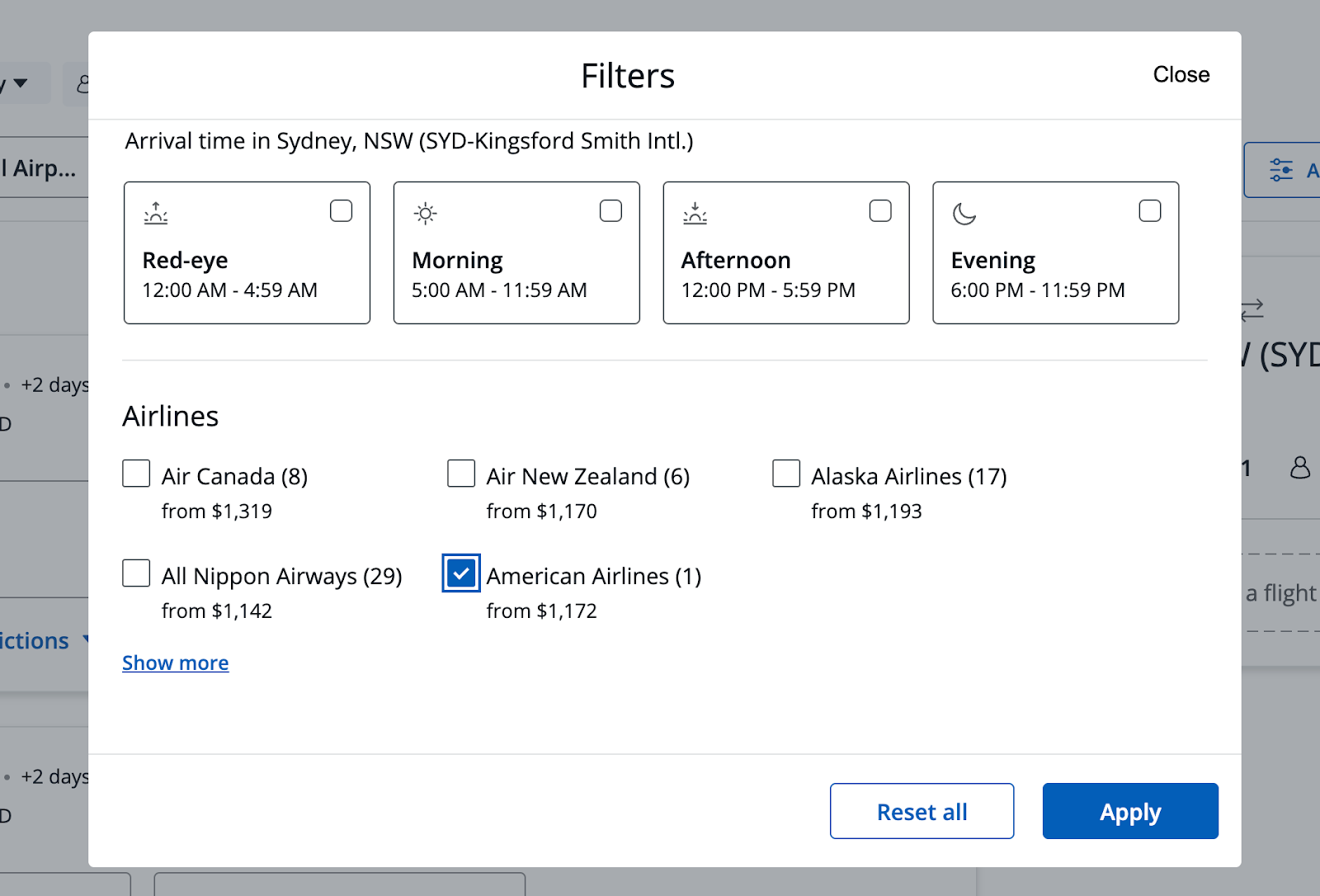 For this example, let’s try looking for a round-trip economy main cabin flight from Los Angeles (LAX) to Sydney (SYD) in early May. When the search results come in, choose the “All filters” button in the top right corner, scroll down to where it says “Airlines,” then click on “American Airlines” and “Apply.”