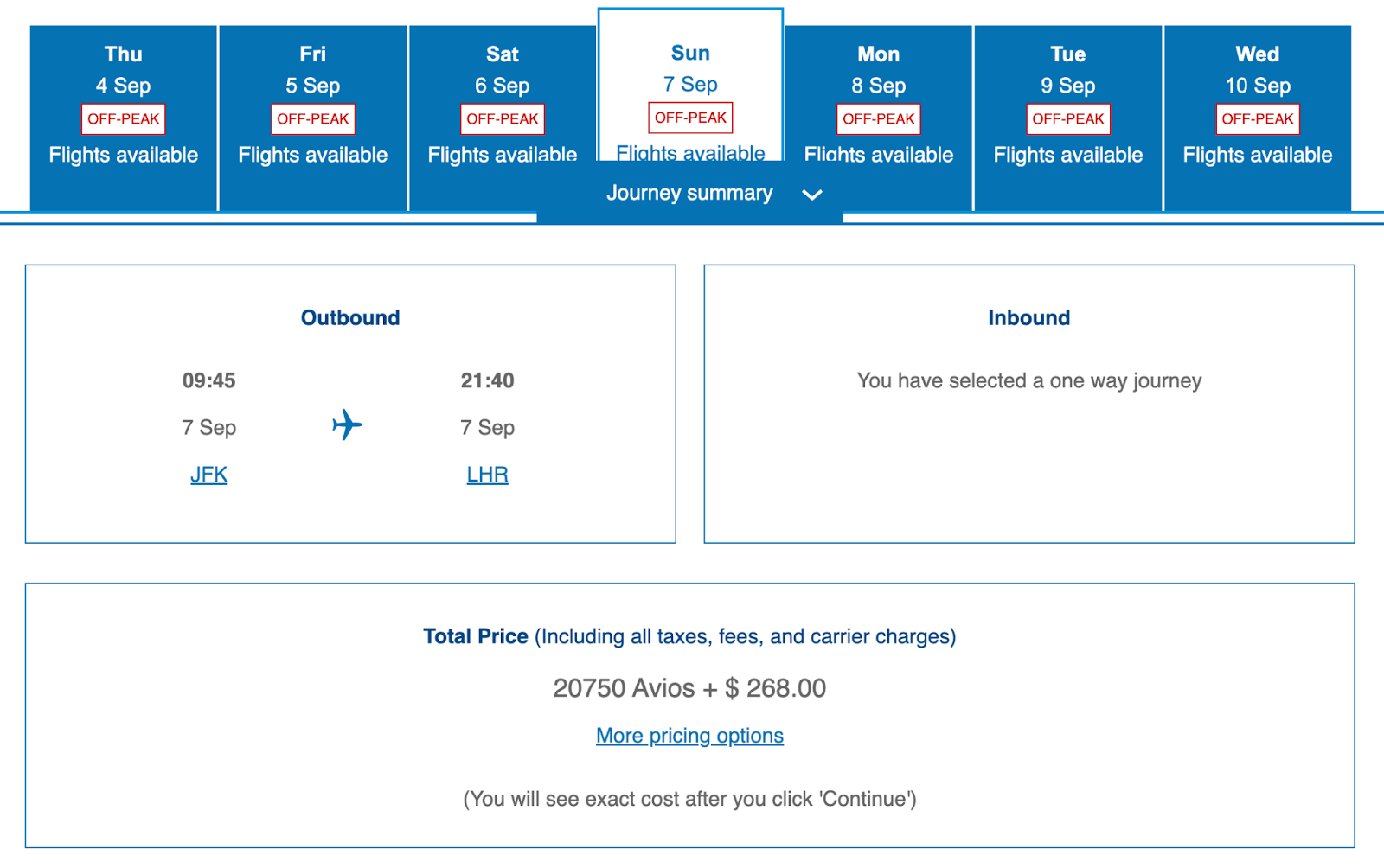 Clicking through the results showed economy flights priced at 20,750 Avios plus $268 in taxes and fees when traveling in the off-peak season.