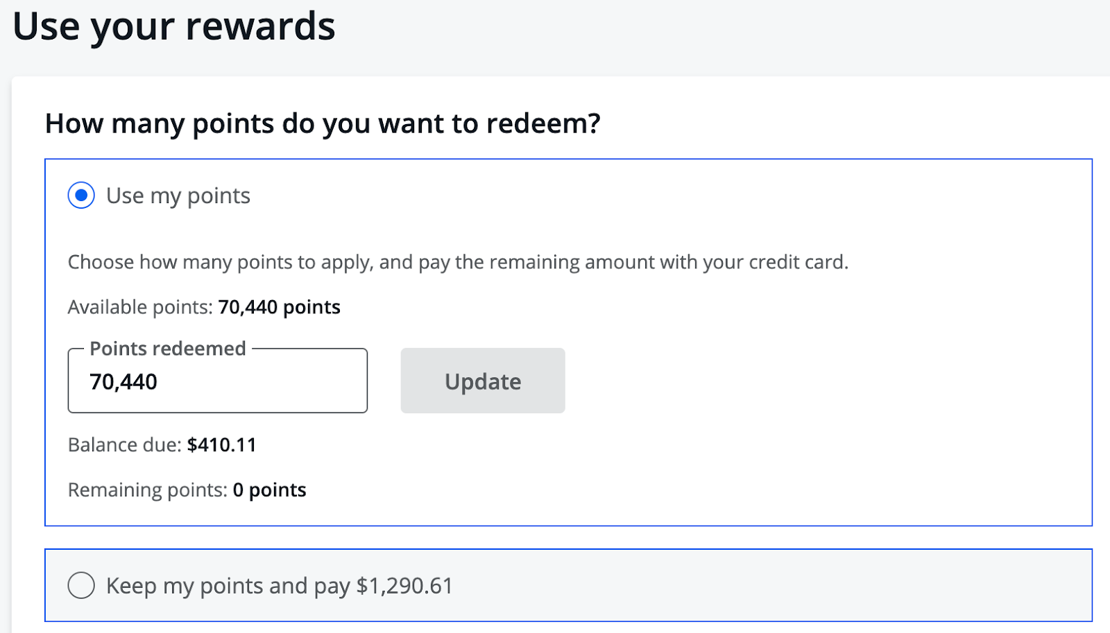 The last page lists all the pricing details. Scroll down to choose how many Chase points you’d like to redeem, whether that means covering the entire flight or just using a portion and paying cash for the remaining balance. The example below is what it looks like if you don’t have enough points to cover the entire flight.