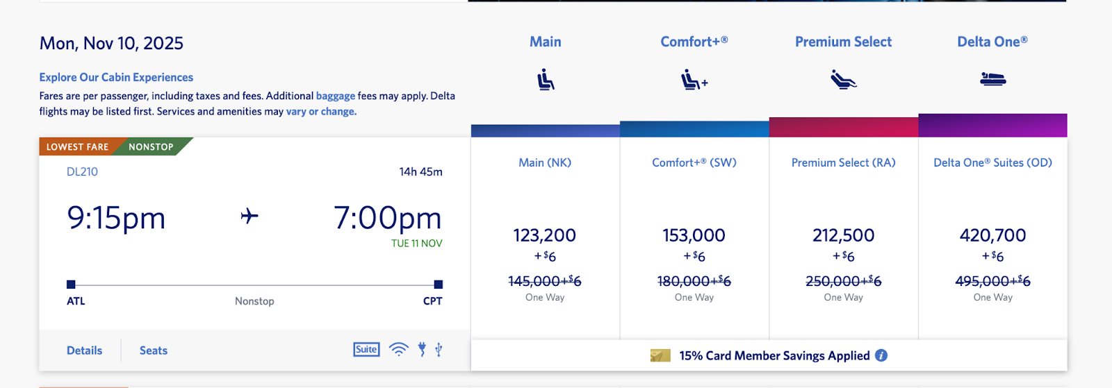 An ultra-long-haul flight, like the 15-hour journey from Atlanta (ATL) to Cape Town (CPT), could cost as much as 180,000 SkyMiles each way in Comfort+.