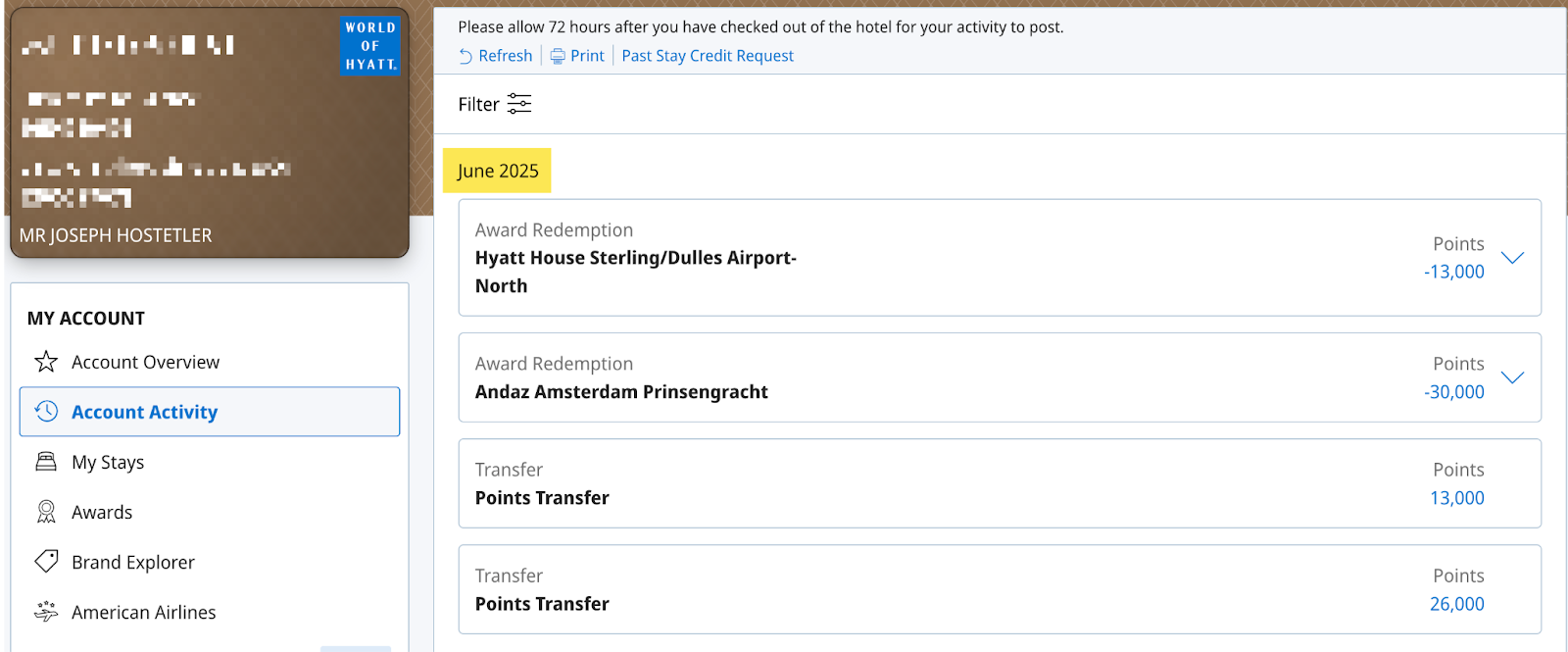 After login, you’ll notice an “Account Activity” tab along the side of the page. This shows you everything that’s happened to your account within the past 24 months — from stays to points you’ve earned to rewards you’ve transferred.