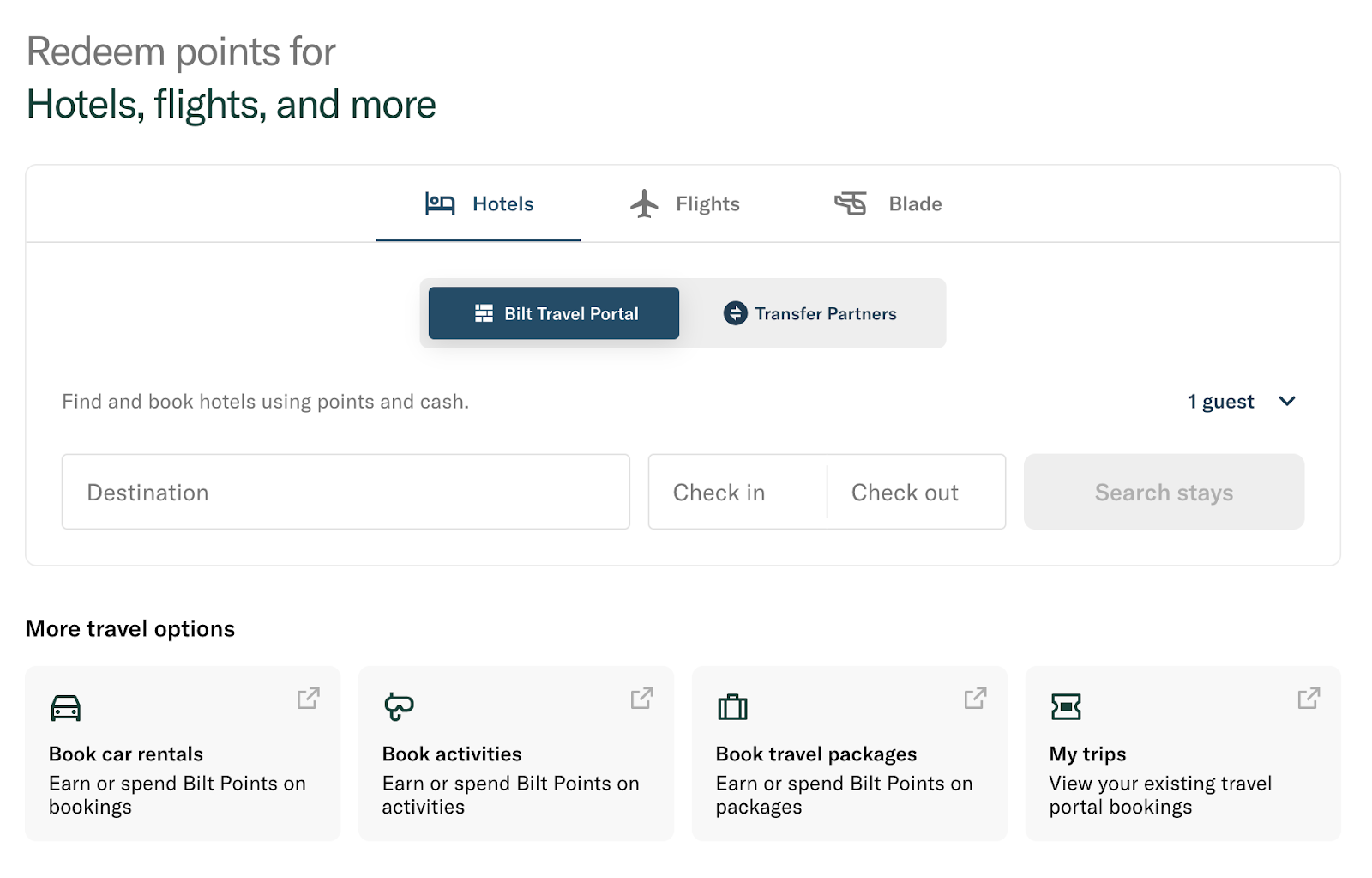 Through the Bilt Rewards travel portal, you can use your points to book flights, hotels, travel packages, rental cars, and activities. No matter what you book, your points are always worth 1.25 cents each toward Bilt travel bookings.