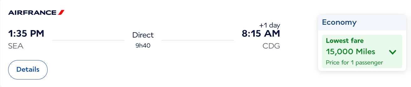 Air France and KLM share the Flying Blue program, which publishes discounted award flights every month under its Promo Rewards. Here’s a Promo Reward flight from Seattle (SEA) to Paris (CDG) for 15,000 miles per passenger, requiring you to transfer 15,000 Bilt points to Flying Blue. Normally, these flights cost 20,000 miles per passenger, and you’ll pay $96.90 in taxes and fees.