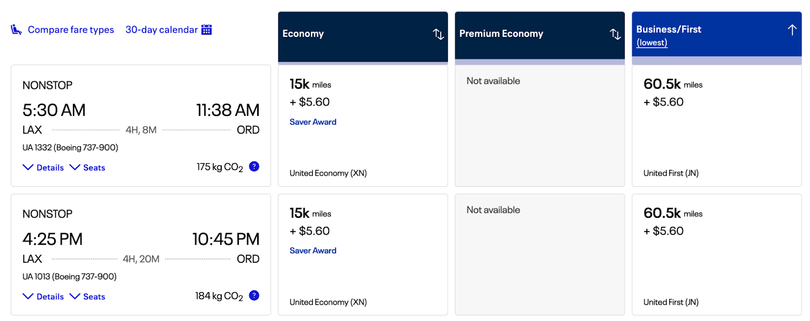 What about a United Airlines flight from Los Angeles to Chicago? Transferring points for a seat in economy class would be a good deal here, but first class could be better off booked in the travel portal.