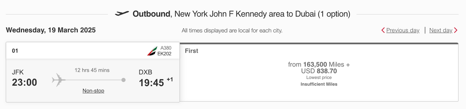 If you’re looking for true luxury, flying with Emirates in first class is probably on your list. While you’ll pay 163,500 plus $838.70 per person for a flight from New York City (JFK) to Dubai (DXB), these flights typically cost over $15,000. That’s a redemption value of 8.66 cents per point.