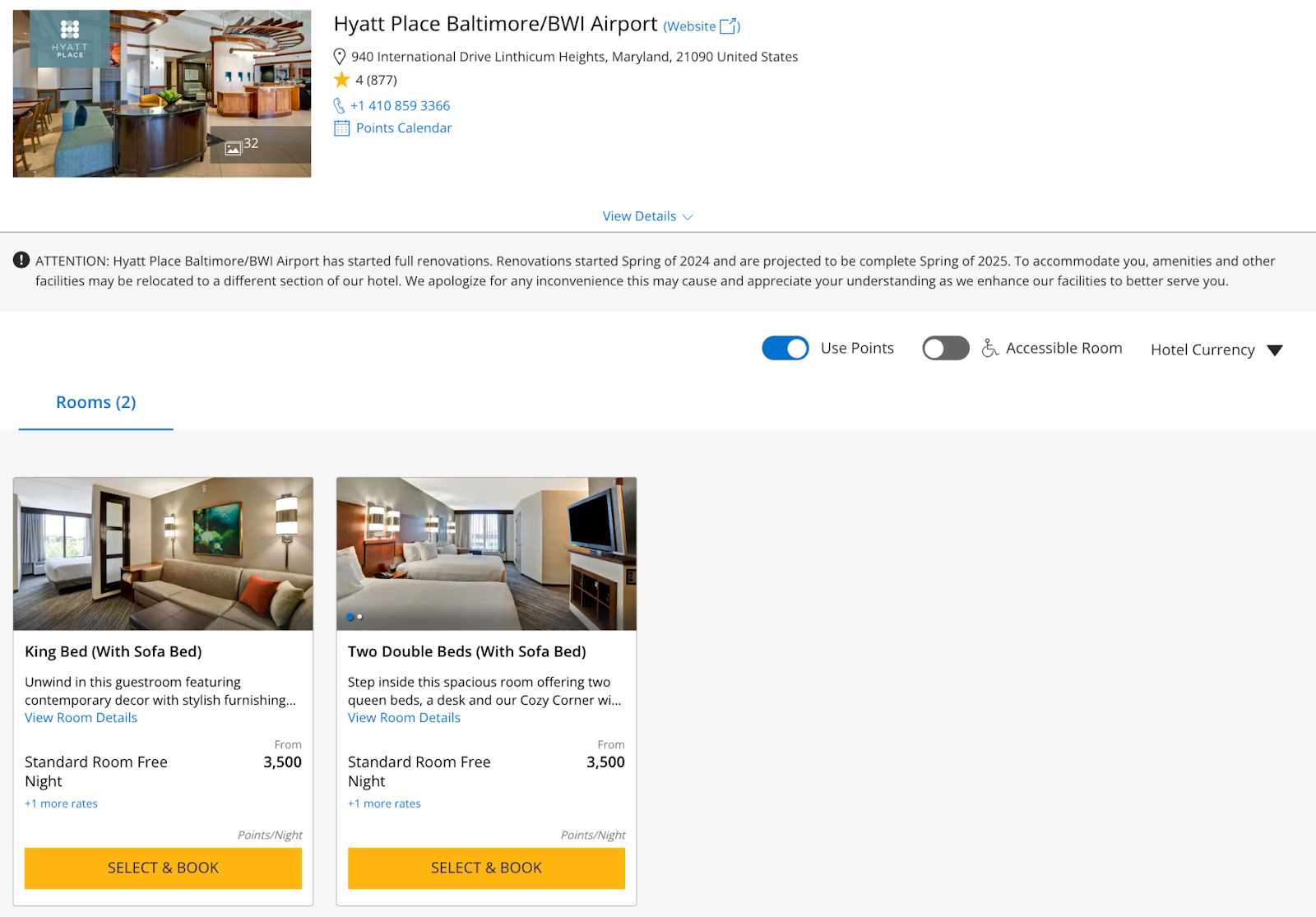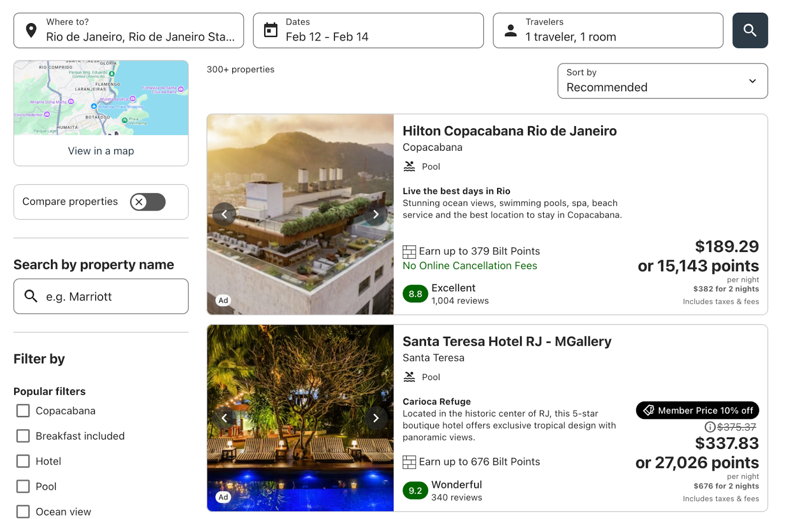 The portal is powered by Expedia and will feel familiar to anyone who’s used Expedia before. On the search results page, you’ll see prices clearly displayed in cash and points.