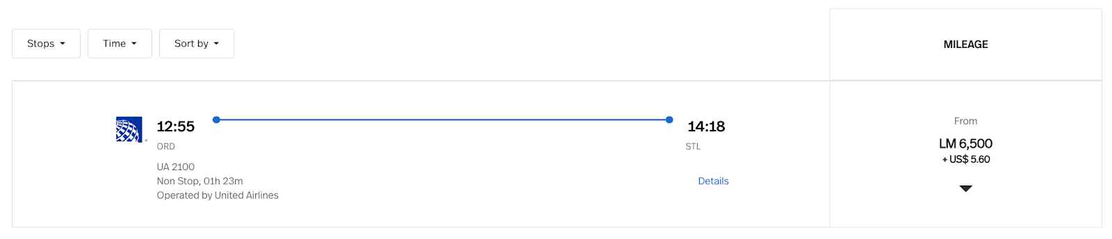 Interestingly, you can often book United Airlines flights within the U.S. cheaper through the Avianca LifeMiles program than what United itself charges. United wants 30,000 miles each way per passenger for this flight from Chicago (ORD) to St. Louis (STL), while LifeMiles is asking for 6,500 miles – less than half the price.