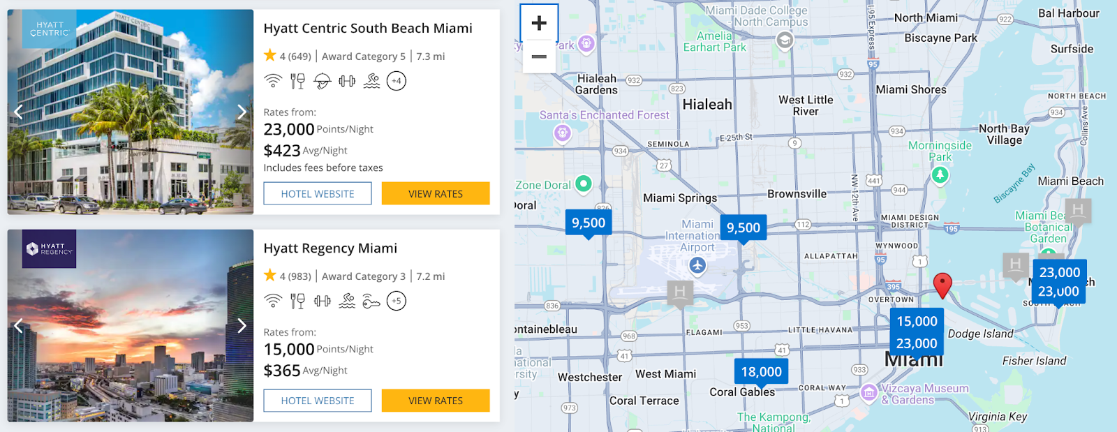 World of Hyatt is a 1:1 Bilt transfer partner. Here’s a sample search for a weekend in Miami next spring. The Hyatt Centric South Beach Miami is charging $423 per night or 23,000 points, providing a value of 1.84 cents per point (though likely higher when you add taxes). That’s a much better value than you would get using the travel portal for 1.25 cents per point. The Hyatt Regency property offers even better value at 2.43 cents per point.