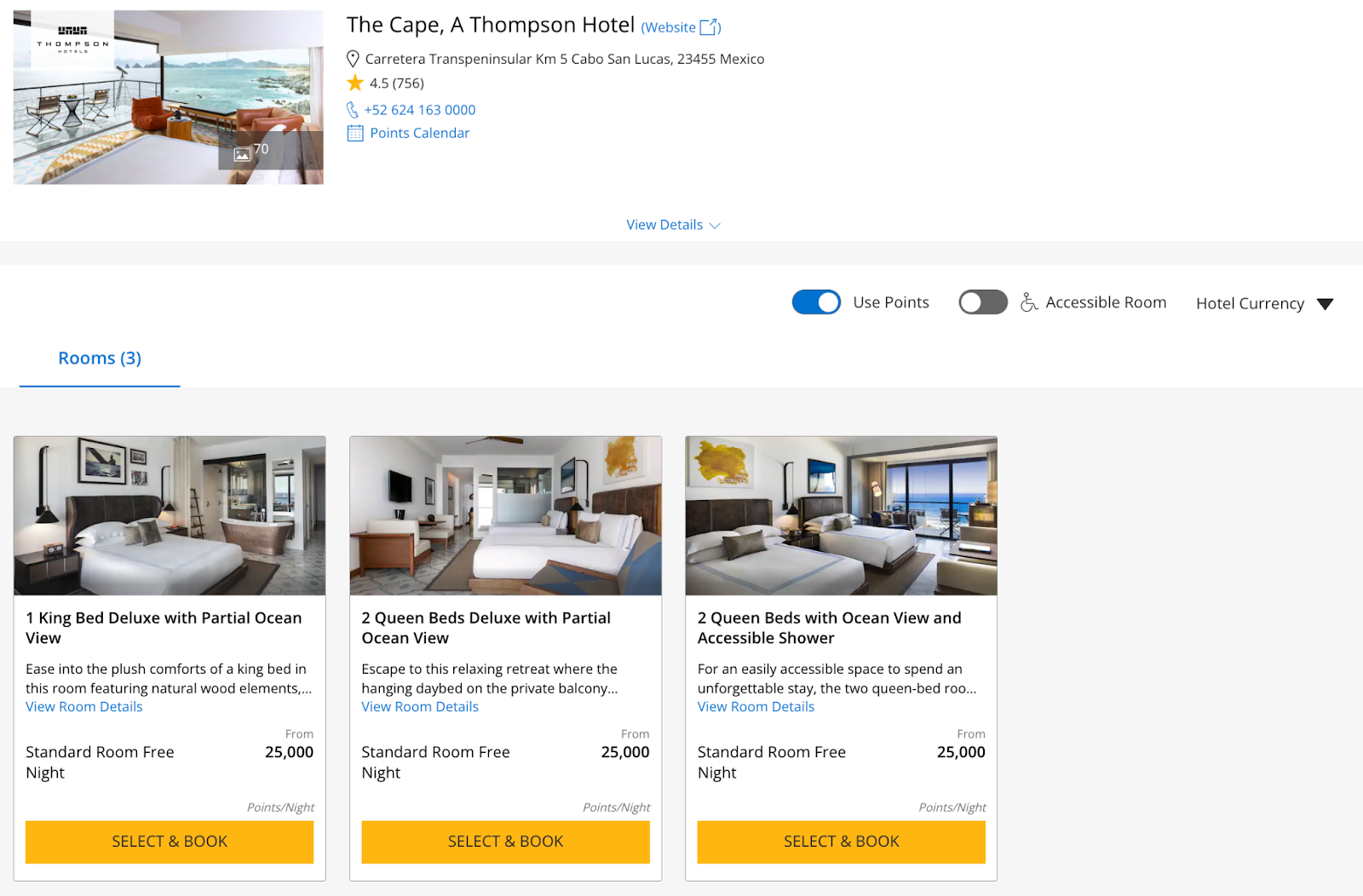 However, the same also holds true at the other end of the spectrum, where luxury properties have high prices that make points redemptions valuable. This room at The Cape in Cabo San Lucas costs over $650 per night after taxes, so spending 25,000 points provides 2.6 cents per point in value.