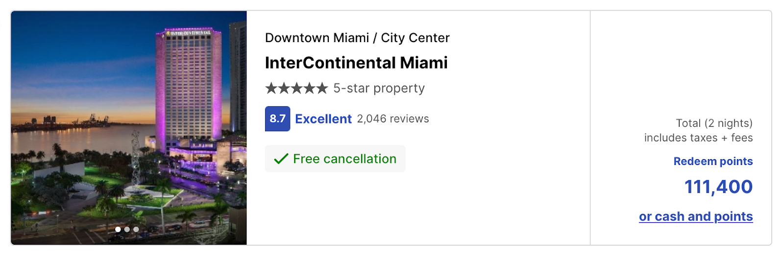 It’s possible to use your Southwest points for hotels, but this tends to provide poor value — usually half a cent per point or less. For example, you could pay 111,400 Southwest points for a two-night stay at the InterContinental Miami.