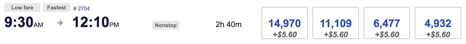 When redeeming points, you’ll pay as much as 14,970 or as little as 4,932 points for your ticket. Notice that all of these options require you to pay $5.60 in government taxes. You’ll pay that per ticket, no matter which fare type you choose.