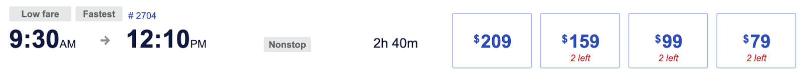 Let’s look at a sample flight between two of Southwest’s traditional hubs: Chicago Midway International Airport (MDW) to William P. Hobby Airport (HOU) in Houston. You could pay as much as $209 or as little as $79, depending on which of Southwest’s four fare types you choose. Your preference will depend on the perks you want, such as priority boarding, premium drinks, and inflight Wi-Fi being included in your ticket cost.