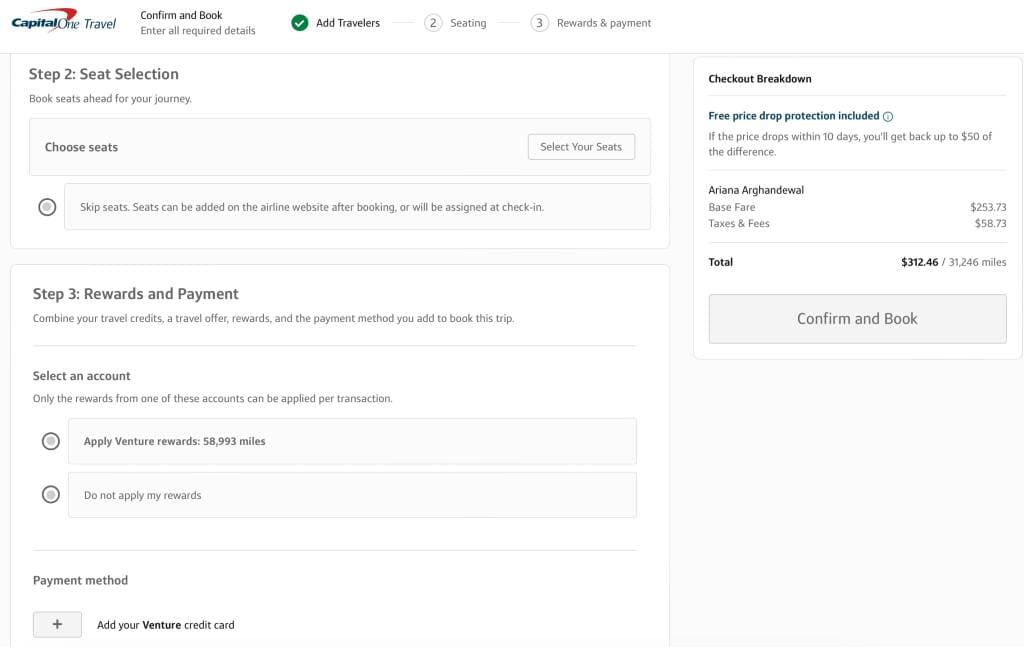 Booking American Airlines flights using Capital One Travel is the most straightforward way to redeem your points. You simply head to the Capital One Travel website, choose the flight you want, and apply Capital One miles to your booking. The clear advantage of this option is its simplicity and the fact that you’ll earn AAdvantage miles on this flight (if you add your frequent flyer number).
