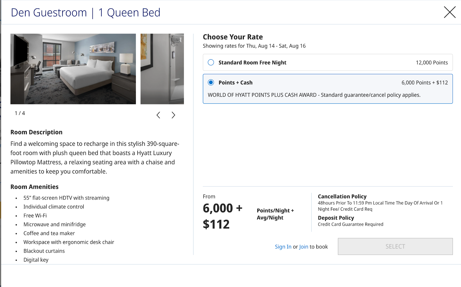 I’m visiting Raleigh, North Carolina, this August for a wedding. The Hyatt House is a Category 3 hotel, so a free night for a standard room during standard travel times would cost 12,000 points. If I wanted to use points + cash, I’d pay half the amount in points (6,000 points) and $112 in cash.
