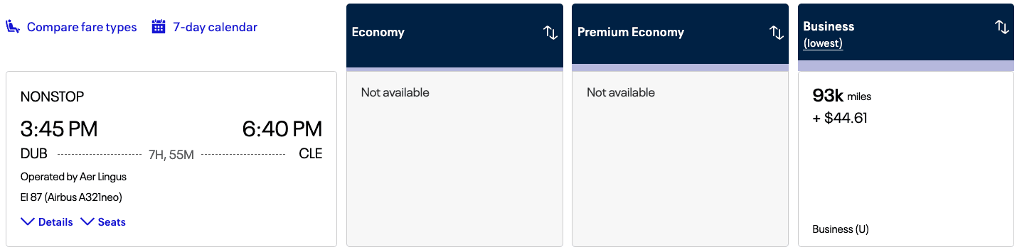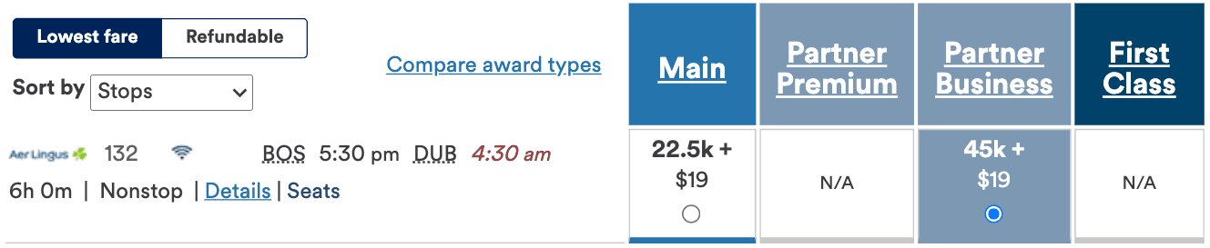Aer Lingus will show you all results for your query — between 50,000 and 75,000 points depending on your route. As an example, here’s a flight from Boston (BOS) to Dublin (DUB) in early July 2025. You’ll pay 60,001 points and $142 in fees.