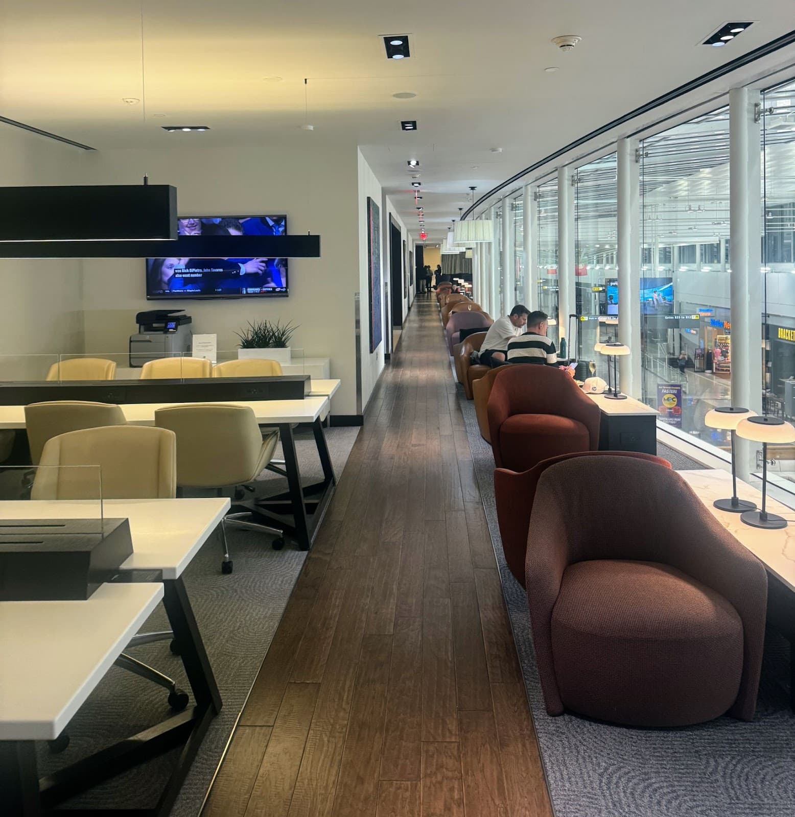 Business class lounges are often comfortable spaces with decent food and free alcohol. You’ll typically find plenty of comfortable seats with lots of electrical outlets. Some even have shower suites.