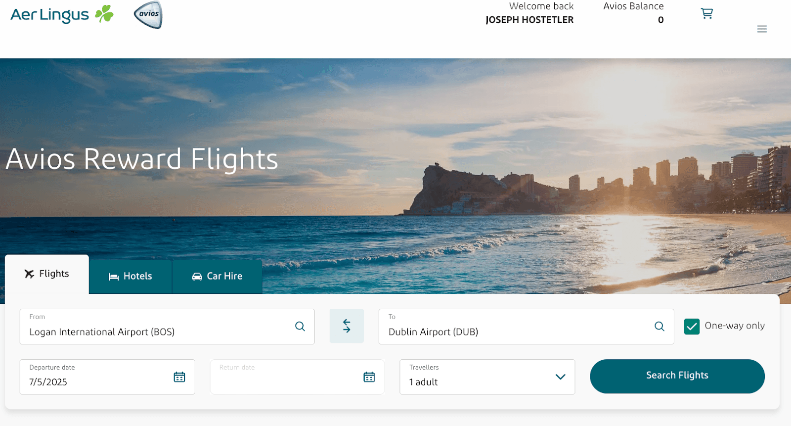 This will take you to the Aer Lingus award booking platform. Enter your origin and destination, and dates. Then click “Search Flights.”