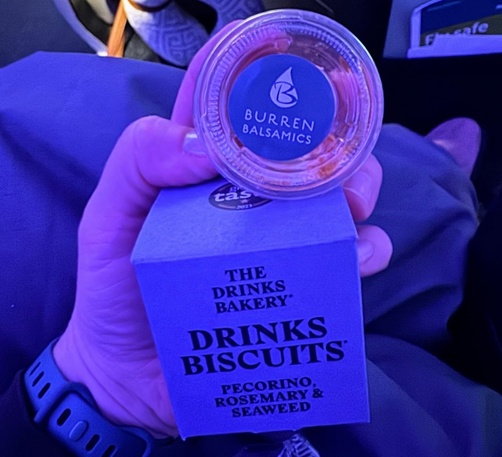 Though simple, one of my family’s best treats aboard our recent flight from Washington Dulles (IAD) was a box of savory “Drinks Biscuits” with a unique balsamic dipping ramekin.