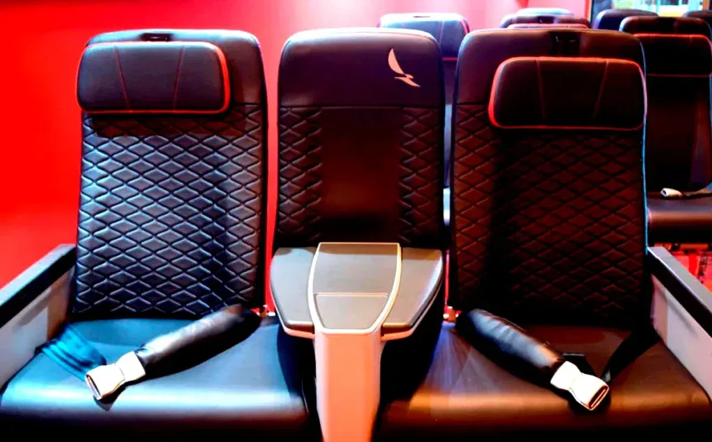 On single-aisle aircraft, like the Airbus A320, the “business class” is more of an “economy plus” seat. It’s located in the first three rows of the aircraft and features more recline, wide armrests, reserved space, and charging ports. The middle seat in the standard row of three is blocked off and used as an armrest. You’ll technically have more space than in economy, but it’s not a huge difference.