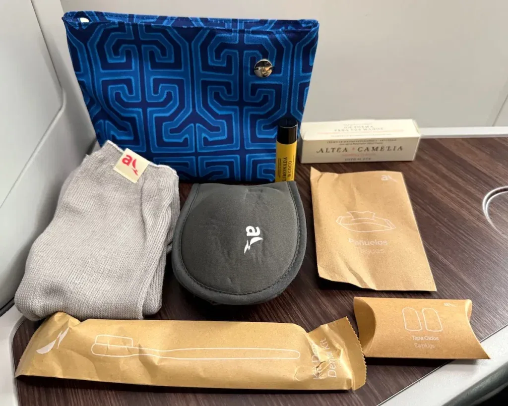 On round-trip flights longer than four hours, you’ll receive a Colombian-inspired amenity kit in collaboration with Mola Sasa and Loto del Sur. The pouch by Mola Sasa is made from recycled PET bottle fabric and designed with the help of women from the Gunadule community. Inside are products from Loto del Sur.