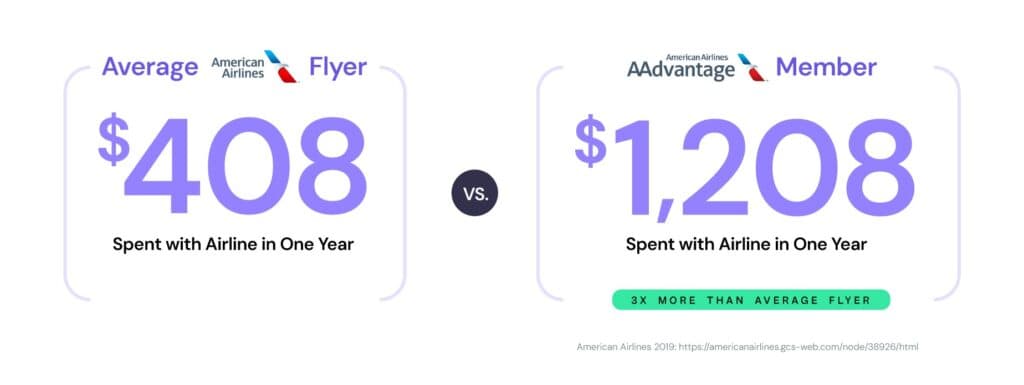 For example, in 2019, American Airlines reported that the average flyer spent just $408 with them while the average member of their AAdvantage loyalty program spent three times that — $1,220.