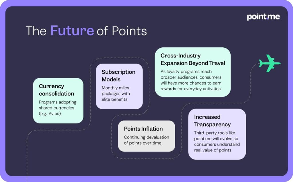 Subscription models within loyalty programs will also continue to rise. Some programs offer subscriptions in which members get a low price on miles (like $200 a month for 18,000 miles) and allow engaged customers to unlock desired seats, point bonuses, and discounted awards. These changes signal a future where loyalty programs continue to evolve beyond traditional earning and redemption structures, creating more opportunities (and complexities) for consumers to navigate. Third-party tools and resources like point.me will continue to play a crucial role in helping consumers navigate these changes.