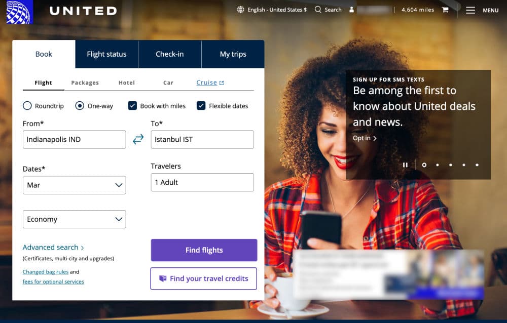 Let’s look at an example. United doesn’t fly to Turkey, but we’ll use United miles to get there anyway. Type your travel details into United’s search engine as you normally would. We’ll search from Indianapolis (IND) to Istanbul (IST) in early 2025.